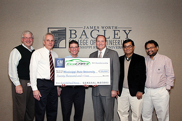 General Motorsâ Gary Rushton visited Mississippi State Tuesday (Nov. 18) to present seed money to the universityâs EcoCAR3 team. Â As the teamâs mentor, Rushton will help guide the team as it re-engineers a Chevrolet Camaro during the four-year competition. From L-R: CAVS director Roger King, faculty adviser Randy Follett of electrical and computer engineering, Rushton, President Mark Keenum, and faculty advisers from mechanical engineering Sundar Krishnan and Kalyan Srinivasan.