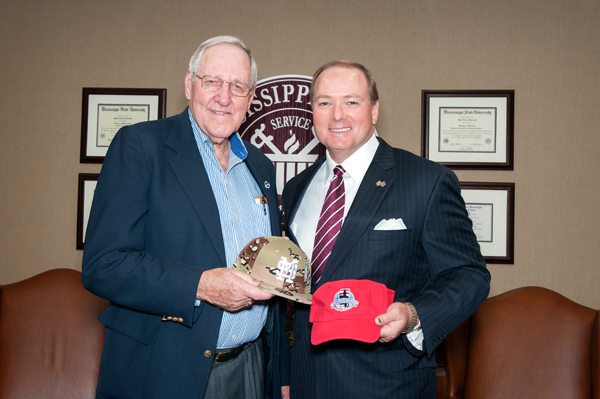 Jack Winstead, a board member of Friends of Mississippi Veterans (FMV), presented Mississippi State University president Mark E. Keenum with a FMV cap and received a MSU camo baseball cap from the president.