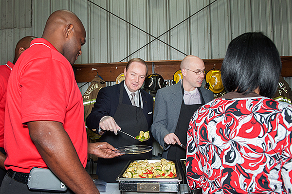 Mississippi State President Mark E. Keenum, center left, and Starkville Mayor Parker Wiseman serve Starkville firefighters and first responders at the annual Thanksgiving celebration at Fire Station One. Each year, MSU and city officials gather at the university-sponsored meal to thank those who serve for their dedication.