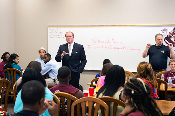 Mississippi State President Mark E. Keenum, center, tells students participating in the university's TRIO program about the skills they'll need to be successful academically and professionally. TRIO is for first-generation students who learn about all the social and academic resources available on campus and how to manage time effectively.