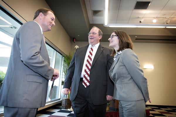Mississippi State President Mark E. Keenum, left, discusses the universityâs partnership with G.V. "Sonny" Montgomery Veterans Administration Medical Center Director Joe D. Battle and Veterans Health Administration Office of Rural Health Director Gina Capra. MSU is the first institution of higher learning in the nation to partner with the VA to provide local and student veterans on-campus, specialized healthcare services.