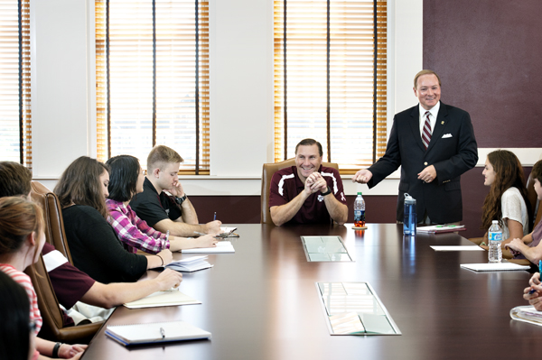 Mississippi State President Mark E. Keenum, standing, introduces head football coach Dan Mullen, center, to the honors leadership class.