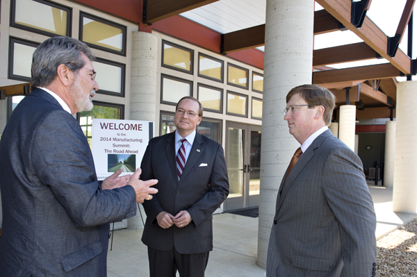 Mississippi State University's annual Furniture Summit hosted Mississippi Lt. Gov. Tate Reeves, right, as keynote speaker. Franklin Furniture Institute Director Bill Martin, left, discusses furniture manufacturing initiatives with MSU President Mark E. Keenum and Reeves.