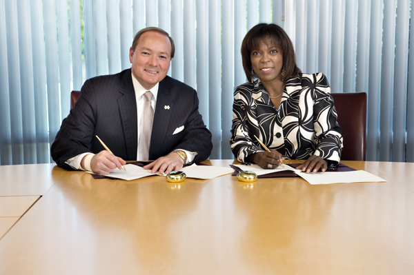 MSU President Mark E. Keenum and Ertharin Cousin, executive director of the United Nations World Food Programme, signed a memorandum of understanding on Friday [May 16], formalizing a partnership for finding innovative solutions to hunger and poverty.