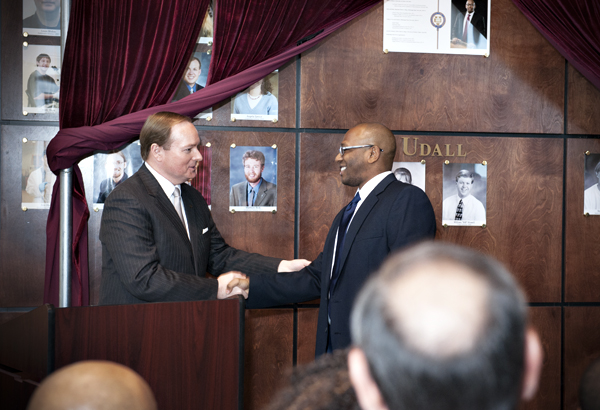 MSU President Mark E. Keenum congratulates Rhodes Scholar Donald M. "Field" Brown at a formal recognition ceremony Tuesday [Jan. 28]. Keenum unveiled a plaque with Brownâs picture to be prominently featured on the Shackouls Honors Collegeâs Wall of Fame in Griffis Hall.