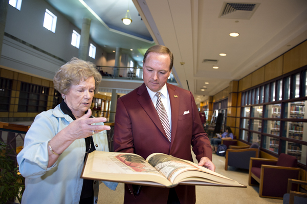 MSU President Mark E. Keenum recently presented MSU Libraries Dean Frances Coleman with a copy of Ptolemy's Cosmographia. Given to Keenum by Bill Berkley, board chairman and chief executive officer of the W.R. Berkley Corporation, who visited MSU for a speaking engagement. Berkley owns an original copy of the work, which in 1482 introduced mathematics and the idea of accurate measurement to map making.