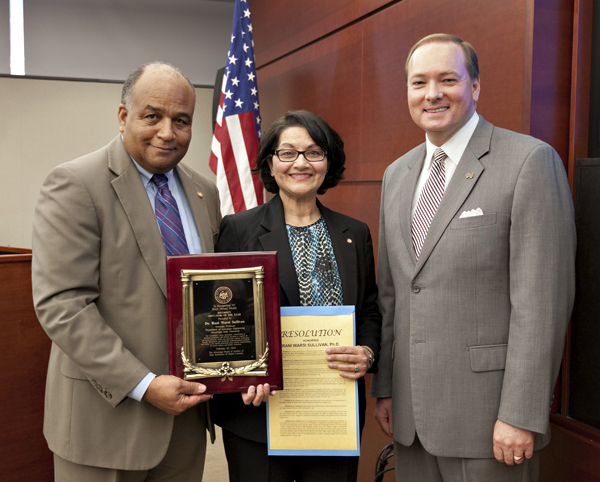 Rani Warsi Sullivan, center, associate professor of aerospace engineering at Mississippi State University, was named the 2014 Diversity Educator of the Year on Feb. 20 by the Board of Trustees of State Institutions of Higher Learning. Presenting Sullivan with the award are IHL Board Member and MSU alumnus C.D. Smith, Jr. of Meridian, left, and MSU President Mark E. Keenum. Sullivan, also an academic advisor to senior aerospace students in MSUâs James Worth Bagley College of Engineering, was honored during a Black History Month ceremony in Jackson which recognized university faculty and staff from colleges and universities around the state.