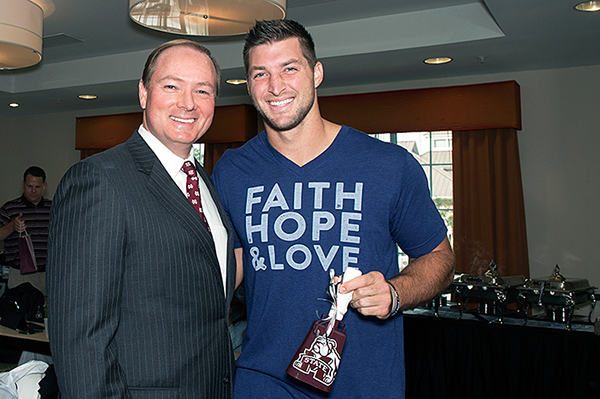 Tim Tebow, right, co-host of the SEC Networkâs college football morning show "SEC Nation," received an MSU cowbell this morning [Oct. 3] from university President Mark E. Keenum at a production meeting for Saturdayâs live broadcast from the Junction. Itâs an historic weekend for MSU, with the undefeated Bulldogs, ranked 12th in the country, taking on undefeated, 6th-ranked Texas A&M at 11 a.m. on Saturday in Davis Wade Stadium.