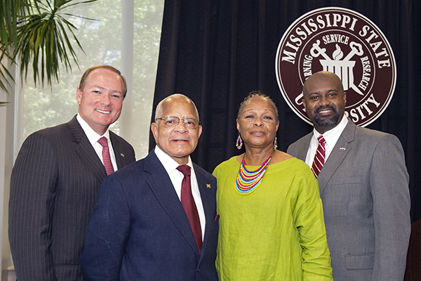 Dr. Richard E. Holmes became the first African American student admitted to Mississippi State University on July 19, 1965. Celebrating the 50th anniversary of that event Sunday during a reception were: MSU President Mark E. Keenum, Holmes, his wife Judie Holmes, and MSU Assistant Vice President for Multicultural Affairs Cedric Gathings.
