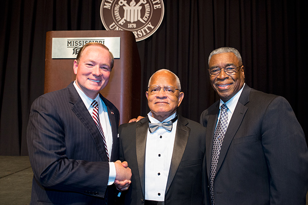 Dr. Richard E. Holmes, center, became the first African American student admitted to Mississippi State University in 1965. Reared in Starkville, the retired physician and longtime Columbus resident was honored by his alma mater Thursday [Oct. 15] with a "50 Years of Inclusion" dinner in Colvard Student Union's Bill R. Foster Ballroom. Among those joining in the celebration were MSU President Mark E. Keenum, left, and guest speaker Dolphus Weary, co-founder of R.E.A.L. Christian Foundation in Richland.