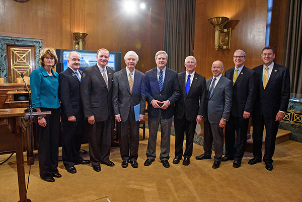 Members of the U.S. Senate and House of Representatives met Thursday, May 14, for a news conference to discuss the next steps and goals for the newly-named Unmanned Aerial Systems Center of Excellence (UAS COE), a consortium of universities that will research and develop technologies and policies for the use of unmanned aerial systems in the United States. The Federal Aviation Administration (FAA) has named the Alliance for System Safety of UAS through Research Excellence (ASSURE), a consortium of universities headed by Mississippi State University, to lead the UAS COE. Included in the press conference are, from left, Sen. Lisa Murkowski (R-Alaska); retired Maj. Gen. James Poss, U.S. Air Force, ASSURE UAS executive director; President Mark Keenum, Mississippi State University; Sen. Thad Cochran (R-Miss.); Sen. John Hoeven (R-N.D.); Sen. Roger Wicker (R-Miss.); FAA Administrator Michael Huerta; Rep. Kevin Cramer (R-N.D.); and Rep. Gregg Harper (R-Miss.).
