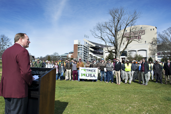 Mississippi State officials, along with members of the university's student chapter of the Society of American Foresters and the Campus Tree Advisory Committee, gathered today [Feb. 13] in the Junction to celebrate the land-grant institution's Tree Campus USA designation by the Arbor Day Foundation.