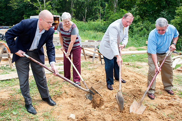 Mississippi State University and the Starkville Area Habitat for Humanity broke ground Monday [Aug. 10] at the site of the seventh annual Maroon Edition home, located at No. 5 Hope Lane in Starkville. (From left) Starkville Mayor Parker Wiseman; Starkville Habitat Board President Suzanne Dressel; MSU President Mark E. Keenum; and Starkville Habitat Past President Danny Setaro officially break ground for the home. Keenum also drove the ceremonial first nail.