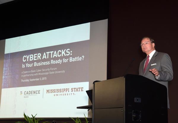 Mississippi State University President Mark E. Keenum gave the opening remarks at a Sept. 3 cyber security forum sponsored by Cadence Bank at The Mill at MSU Conference Center. Titled âCyber Attacks: Is Your Business Ready for Battle,â the forum featured Dave Dampier, director of MSUâs Distributed Analytics and Security Institute, and Wesley McGrew, an institute assistant professor.