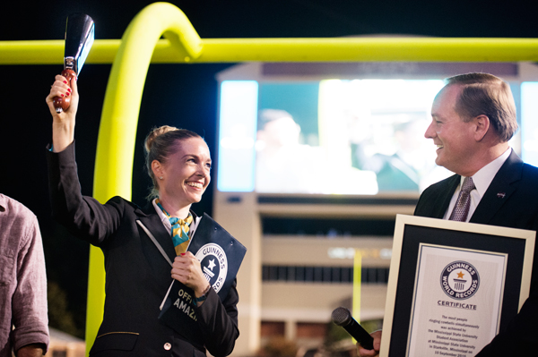 Mississippi State University President Mark E. Keenum (right) accepts a certificate from a Guinness World Records representative Thursday night at the annual Cowbell Yell pep rally.