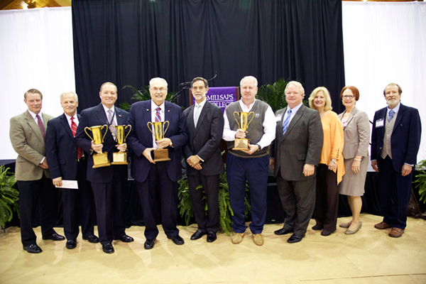 Mississippi State University took top honors during the Halbrook Awards for Academic Achievement Among Athletes ceremony held October 5 as part of the 2015 Mississippi Association of Colleges and Universities Annual Conference. MSU was the winner in the Public University Division for the highest percentage of both male and female athletes graduating. The Halbrook Awards program recognizes colleges and universities that maintain and achieve high academic standards for student athletes, thus encouraging high graduation rates. Pictured are (l-r): Commissioner of Higher Education Glenn Boyce; Northwest Community College Vice President of Educational Affairs Richie Lawson; MSU President Mark E. Keenum; Hinds Community College President Clyde Muse; Millsaps College President Robert W. Pearigen; Millsaps head menâs basketball coach Tim Wise; and representing the Halbrook family were Andy Halbrook, Tina Halbrook Donahoo, Ann Halbrook Peden and David Halbrook Jr.