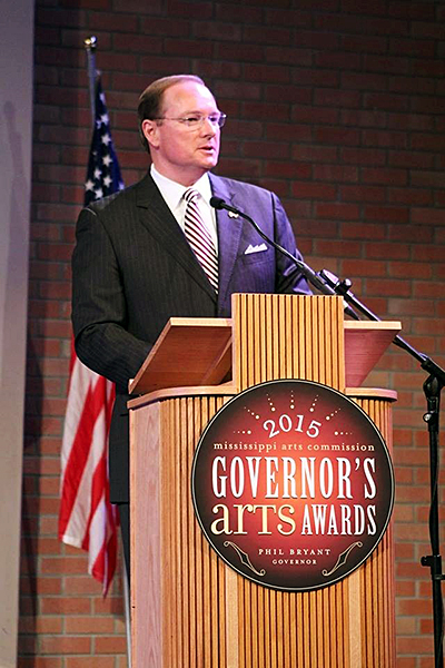 Mississippi State's Riley Center for Education and Performing Arts was recently honored as a recipient of the 2015 Governor's Awards for Excellence in the Arts, given annually by the Mississippi Arts Commission. Winning in the "Arts in Community" category at MAC's 27th annual awards ceremony, the center is part of the MSU-Meridian Riley Campus, which continues to grow thanks to a partnership with the Meridian-based Riley Foundation. On hand to accept the award were several members of the Riley Foundation, Riley Center Executive Director Dennis Sankovich, and MSU President Mark E. Keenum, shown here.