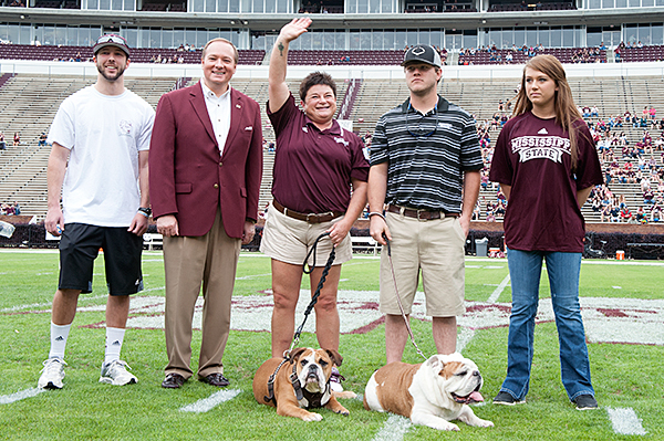 More than 21,000 Mississippi State fans came to Saturdayâs Maroon and White game and watched as Jak, bottom center, became Bully XXI. He accepted mascot duties from his father, Bully XX known as âChamp,â bottom right. Assisting in the ceremony with the American Kennel Club registered English bulldogs were, from left, Jake Clouatre, grandson of longtime Voice of the Bulldogs Jack Cristil; MSU President Mark E. Keenum; Lisa Pritchard, official MSU mascot handler; and Pritchardâs children, Austin and Laura Grace.
