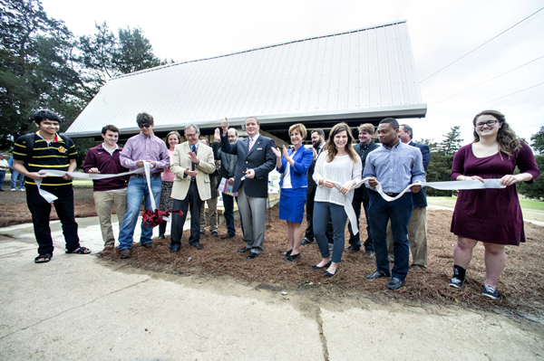 MSU President Mark E. Keenum gives a âthumbs-upâ at the ribbon-cutting ceremony for the on-course shelter at the 10th hole on the MSU Golf Course. During the fall semester, a collaborative studio, including second-year architecture and building construction science students, designed and built two shelters; the other is at the fourth hole. Students, faculty and administrators celebrated at the ceremony.