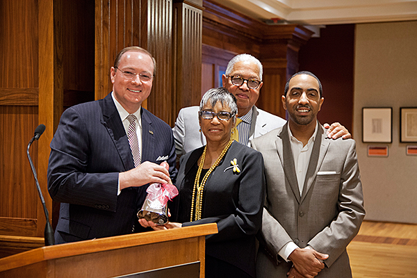 MSU President Mark E. Keenum, left, presents Shirley Kinsey, her husband Bernard, and son Khalil, right, with a chrome cowbell during the March 20 ribbon cutting ceremony for The Kinsey Collection’s “African American Treasures” exhibit at the unive