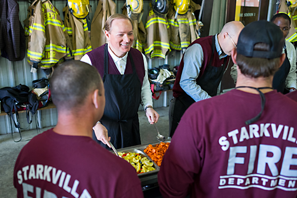MSU President Mark E. Keenum serves members of the Starkville Fire Department during the Thanksgiving lunch held Friday [Nov. 20]. Keenum, along with Starkville Mayor Parker Wiseman, takes the opportunity annually to thank the fire fighters for their service throughout the year.