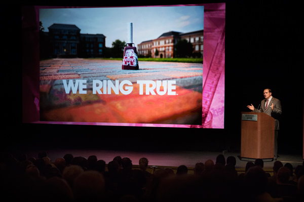 MSU President Mark E. Keenum speaks during a campus celebration Tuesday [Oct. 13] as the university launches a branding initiative to reinforce its standing as a premier research institution where students are driven to make a difference. Keenum challenged the campus community to take active roles in shaping the future of MSU by sharing their success stories with broader audiences.