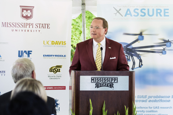 President Mark Keenum speaks at Mississippi State University Friday [June 5] during a campus press conference about the Federal Aviation Administration designating the university as a National Center of Excellence for Unmanned Aircraft Systems.