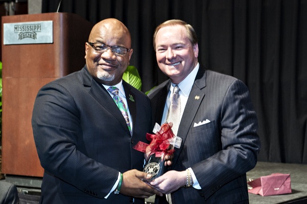 William B. Bynum Jr., left, president of Mississippi Valley State University, received a special cowbell from MSU President Mark E. Keenum. Bynum served as keynote speaker Jan. 19 for Mississippi Stateâs 21st annual Martin Luther King Jr. Day Unity Breakfast.