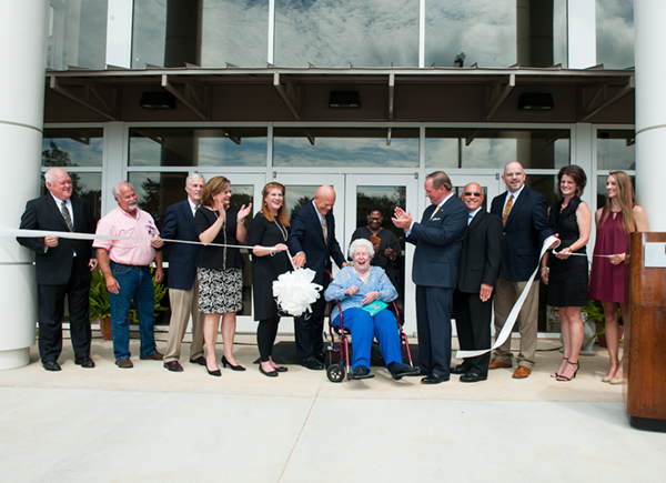The Baptist Student Union at Mississippi State University celebrated its new building with a ribbon-cutting ceremony Monday [Aug. 22]. Pictured (left to right) are: Mississippi Baptist Convention Board Collegiate Ministry Director Lloyd Lunceford; Steve West of West Brothers Construction; Larry Singleton of Singleton Architects; MSU Vice President for Campus Services Amy Tuck; MSU Associate BSU Director June Scoggins; Mississippi Baptist Convention Board Executive Director Jim Futral; BSU alumna and donor Frances Langerfeld and friend Julia Bradford; MSU President Mark E. Keenum; BSU Director Michael Ball; Mississippi Baptist Convention Board Associate Executive Director Barri Shirley; MSU Associate BSU Director Ashley Taylor; and BSU 2016 President Rebecca Frady.