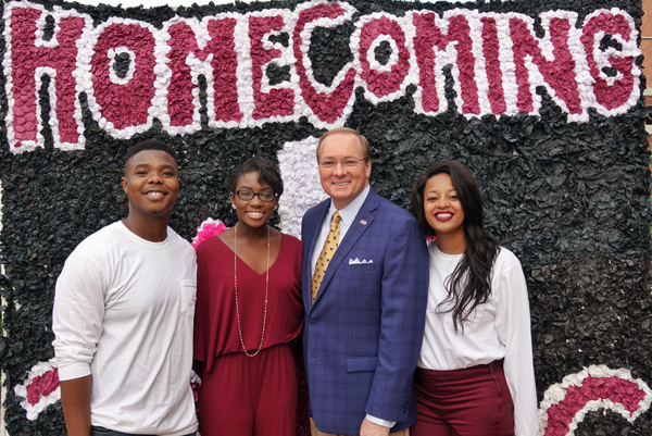 To begin Homecoming Week 2016, MSU President Mark E. Keenum, center, served up âPancakes on the Plazaâ with Malik Ross, left, homecoming director; Shawanda Brooks, queen; and Pyliceia âFefeâ Brown, co-director.