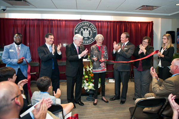 Mary Ann Deavenport cuts the ribbon during the dedication ceremony for Earnest W. and Mary Ann Deavenport Hall on Oct. 7, 2016, at Mississippi State. Pictured, from left, are Resident Hall Association President Nicolas Harris, Starkville First Presbyterian Church Senior Pastor Martin Lifer, Earnest W. Deavenport Jr., Mary Ann Deavenport, MSU President Mark E. Keenum, MSU Vice President for Student Affairs Regina Hyatt and MSU Student Association President Roxanne Raven.