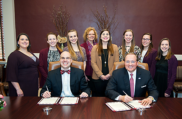 Mississippi State University President Mark E. Keenum, seated right, and Starkville Mayor Parker Wiseman met with MSU’s Student Dietetic Association officers and advisor to proclaim March as National Nutrition Month for MSU and the city of Starkville.
