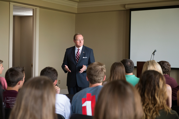 Mississippi State University President Mark E. Keenum speaks with visiting high school students from Brookhaven Wednesday [Sept.
