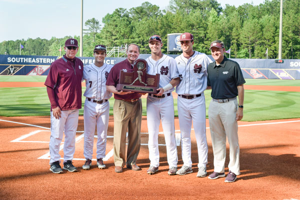 Mississippi State University was presented the 2016 Southeastern Conference Baseball Championship trophy prior to the Bulldogsâ first game in the SEC Tournament Hoover, Alabama, on Wednesday [May 25). Shown receiving the trophy were (from left) MSU Head Baseball Coach John Cohen, Jacob Robson, MSU President Mark E. Keenum, Brent Rooker, Dakota Hudson and MSU Athletics Director Scott Stricklin.