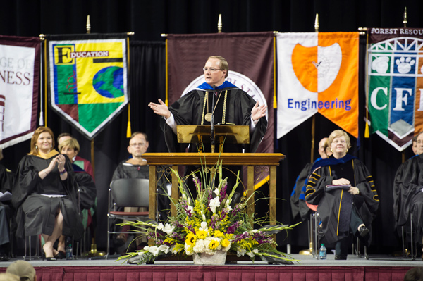 MSU President Mark E. Keenum addressed an estimated 3,700 first-year freshmen and 1,800 transfer students Tuesday [Aug. 16] during the universityâs third Fall Convocation in Humphrey Coliseum. The author of the universityâs 2016 Maroon Edition common reading experience selection, âThree Little Words: A Memoir,â Ashley Rhodes-Courter shared words of encouragement and life lessons during a keynote speech. Additionally, Provost and Executive Vice President Judy Bonner, Robert Holland Faculty Senate President Cody Coyne, along with Student Association President Roxanne L. âRoxieâ Raven, gave remarks and officially welcomed the universityâs new students to the Bulldog family.
