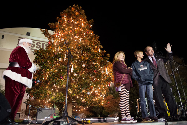 MSU President Mark E. Keenum, along with his daughter Torie and son Rett, worked with Santa to light the Christmas tree during Holiday in the Junction on Dec. 1. The event featured holiday displays, live music, hot chocolate and a smores station.