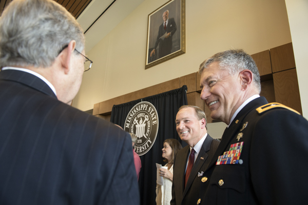 MSU President Mark E. Keenum and Maj. Gen. Janson D. âDurrâ Boyles visit with others in attendance during Fridayâs dedication ceremony for the G.V. âSonnyâ Montgomery Lobby at Nusz Hall. The newly constructed building also is home to the G.V. âSonnyâ Montgomery Center for Americaâs Veterans.