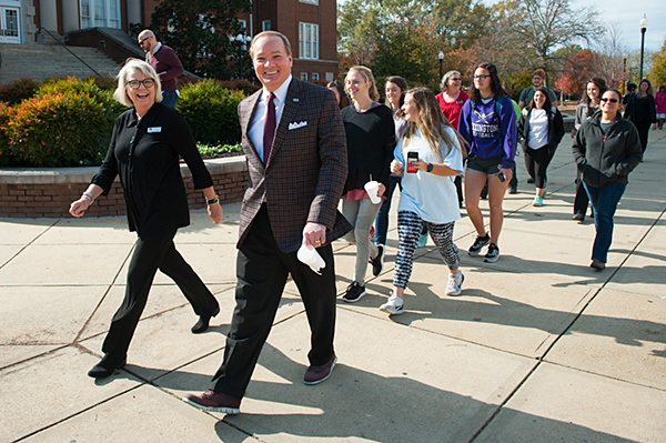MSU President Mark E. Keenum joins a "Celebrity Walk" around the Drill Field with MSU students and Director of Health Promotion and Wellness Joyce Yates.