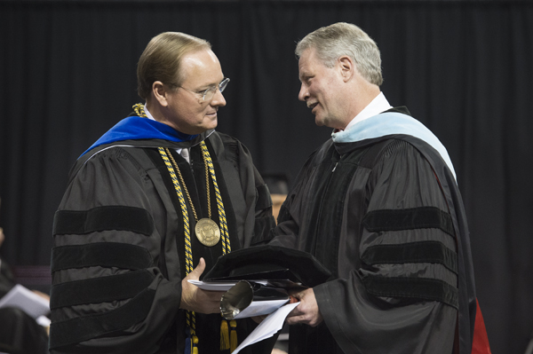 MSU President Mark E. Keenum, left, gives Glenn F. Boyce a cowbell after the commencement address May 7. Mississippiâs higher education commissioner challenged his audience to âdare greatlyâ and âchange the world.â