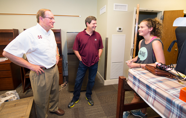 MSU President Mark E. Keenum, left, visits with Natalie L. Wilson, a freshman interior design major from Biloxi, along with her father Anthony Wilson, during MVNU2MSU. Natalie was among hundreds of students who moved into campus residence halls August 6 during the universityâs annual move-in day.