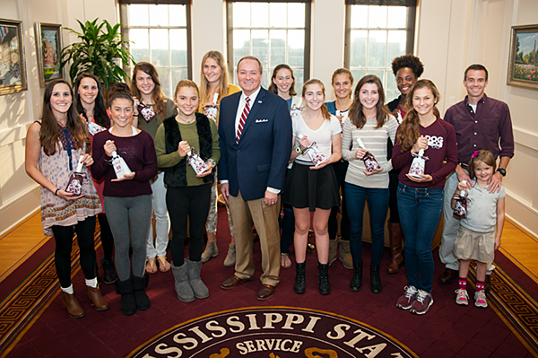 MSU President Mark E. Keenum poses with members of the MSU Cross Country Team and Coach Houston Franks. In November, the team ended its season with its highest ranking in school history at 15th in the country. The Bulldogs also won their first regional in program history. For his efforts, Franks was named USTFCCCA Coach of the Year for the South Region.