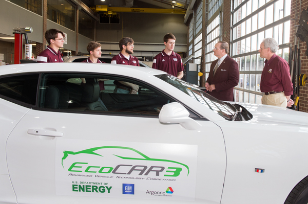 MSU President Mark E. Keenum, second from right, talks with the universityâs EcoCAR3 team as they prepare for upcoming national competition against 15 other universities. General Motors and the Department of Energy sponsor the four-year competition and crown winners during each of the contestâs four phases.
