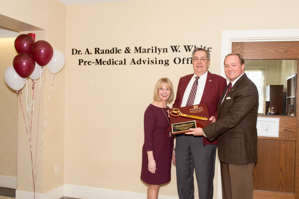 A new academic service dedicated to advising Mississippi State pre-medical majors formally opened Wednesday [Jan. 27]. MSU President Mark E. Keenum, right, presented a pair of golden scissors used during the ribbon cutting ceremony to Marilyn White and Dr. Randy White. The new Dr. A. Randle and Marilyn W. White Pre-Med Advisory Office will create more opportunities for students who are earning degrees with pre-health concentrations. Dr. White is a 1966 MSU chemistry/pre-medicine alumnus who went on to graduate from the University of Mississippi Medical Center in 1969.