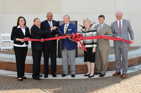 Celebrating a ribbon-cutting ceremony for the new Riley Campus Courtyard in downtown Meridian Aug. 4 are (l-r) MSU Vice President for Campus Services Amy Tuck; President of The Riley Foundation Marty Davidson; Meridian Mayor Percy Bland; MSU President Mark E. Keenum; MSU Provost and Executive Vice President Judy Bonner; MSU Vice President for Development and Alumni John Rush; and MSU-Meridian Administrative Director and Head of Campus Terry Dale Cruse. The courtyard marks the completion of an entire city block restoration that has transformed part of downtown Meridian into a Mississippi State University campus. For more, visit meridian.msstate.edu.