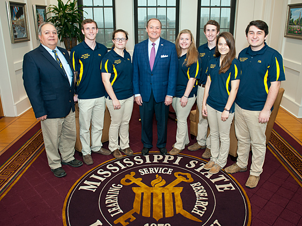 Continuously developing new ways to strengthen ties with student groups across the state, region and nation, Mississippi State President Mark E. Keenum met with Mississippi FFA state officers today [Feb. 23] to praise the group for its support of agriculture, food, fiber and natural resources systems. From left are Lee James, advisor; Tyler McClain, vice president; Kalyn Smith, treasurer; Keenum; Gabby Simpson, sentinel; Will Cornelius, reporter; Kayla Mercer, secretary; and Brice Fortinberry, president.