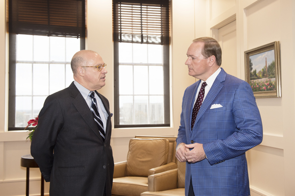 J. Christopher “Chris” Giancarlo, left, chairman of the U.S. Commodity Futures Trading Commission, visits with MSU President Mark E. Keenum during a December meeting at the university.