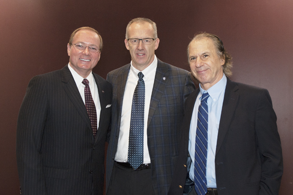Mississippi State University President Mark E. Keenum visits with SEC Commissioner Greg Sankey and best-selling author John M. Barry during the 2017 SEC Academic Conference on Monday [March 27].