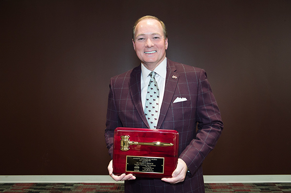 MSU President Mark E. Keenum holds a plaque commemorating his service as president of the Mississippi Association of Colleges and Universities. Keenum led the organization for a one-year term, culminating with the 2017 MAC Annual Conference, which Mississippi State hosted Oct. 2-3 at The Mill at MSU.