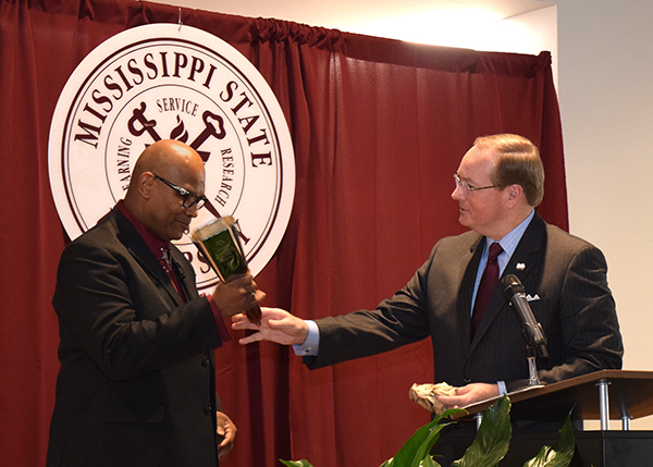 MSU President Mark E. Keenum, right, presents a cowbell to Oktibbeha County Justice Court Judge Larnzy L. Carpenter Jr., who served as the keynote speaker to an overflow crowd at Mississippi State University during the 23rd annual Martin Luther King Jr.