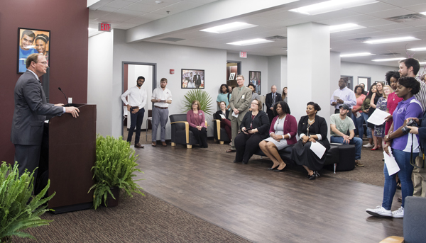 MSU President Mark E. Keenum speaks during Monday’s [March 20] open house for the expanded Holmes Cultural Diversity Center.
